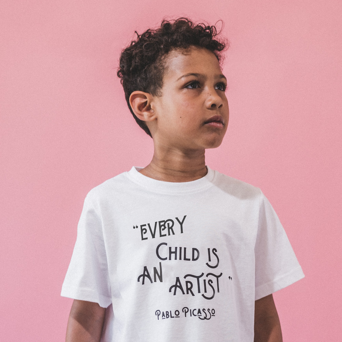 White T-shirt With 'EVERY CHILD IS AN ARTIST' Picasso Quote in Black Font Design.
