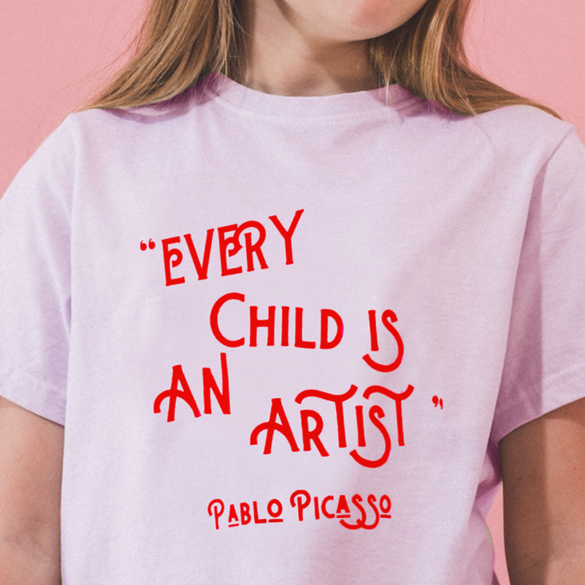 Cotton Pink T-shirt With 'EVERY CHILD IS AN ARTIST' Picasso Quote in Red Font Design.