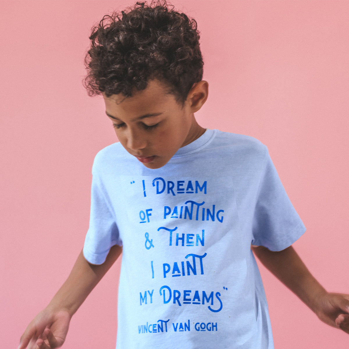 Sky Blue T-shirt With 'I DREAM OF PAINTING & THEN I PAINT MY DREAMS' Vincent Van Gogh Quote in Mid Blue Font Design.