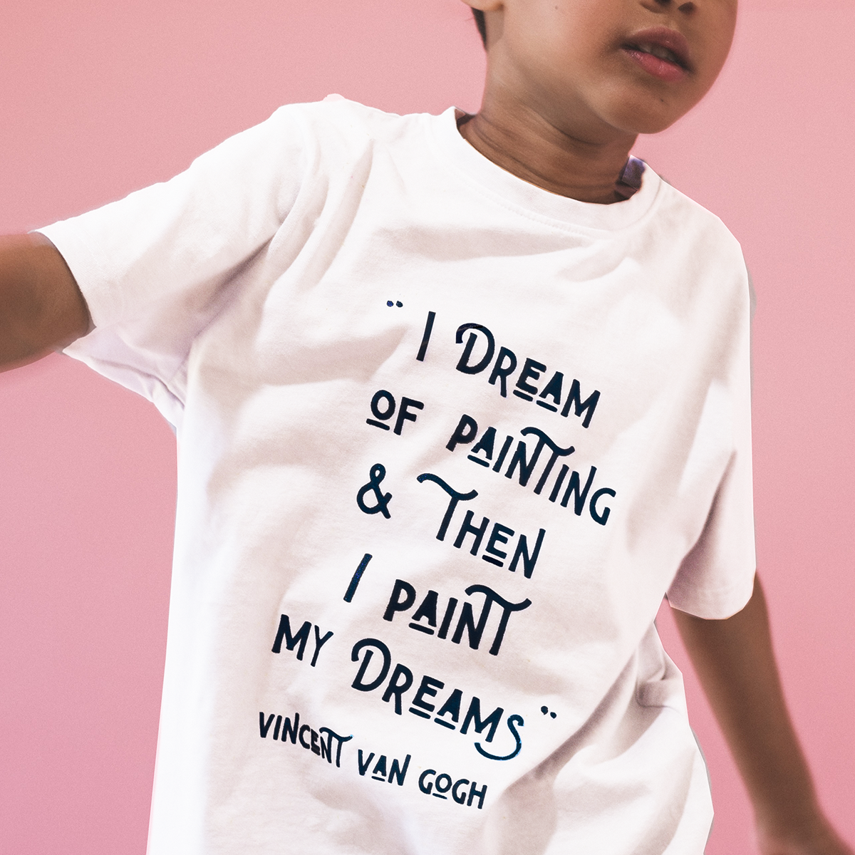 White T-shirt With 'I DREAM OF PAINTING & THEN I PAINT MY DREAMS' Vincent Van Gogh Quote in Black Font Design.