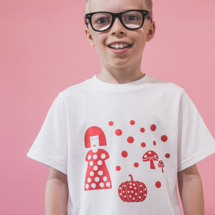 White T-shirt With Yayoi Kusama Design in Red.